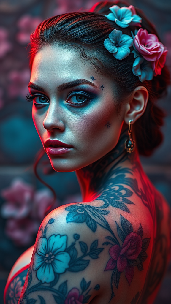 A tattoo artist adorned with vibrant blue tattoos intertwined with delicate flowers across her skin, set against a backdrop of futuristic fantasy. Her intense gaze captivates, evoking the essence of oil portraitures. The scene is infused with a palette of light red and teal, capturing the opulence of rococo portraitures. The atmosphere is dark and explosive as she poses confidently in a photo shoot setting. Incorporating the style of digital manipulation, reminiscent of artists like Tanya Shatseva and Daniel F. Gerhartz, the portrait features dark pink and light blue hues. The composition is rich in intricate imagery, presented in ultra-high-definition, echoing the classic allure of oil painting, yet infused with a modern twist.