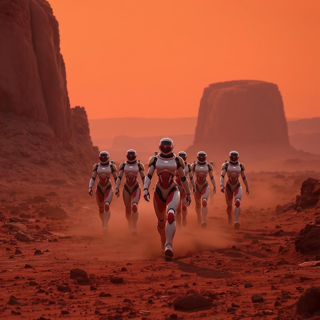 A team of female robot astronauts clad in sleek red and white spacesuits strides purposefully across the rugged Martian landscape. The scene is captured in strikingly realistic photography, enhanced with futuristic sci-fi elements. Shadows stretch dramatically across the desert as the sun sets, casting a warm glow over the horizon. The robots’ polished visors reflect the crimson sky, while their boots leave a trail of prints in the fine, rust-colored soil. Towering rock formations rise in the background, adding a majestic sense of depth to the cinematic atmosphere. Dust swirls lightly around their feet, whispering of ancient secrets held beneath the barren surface.