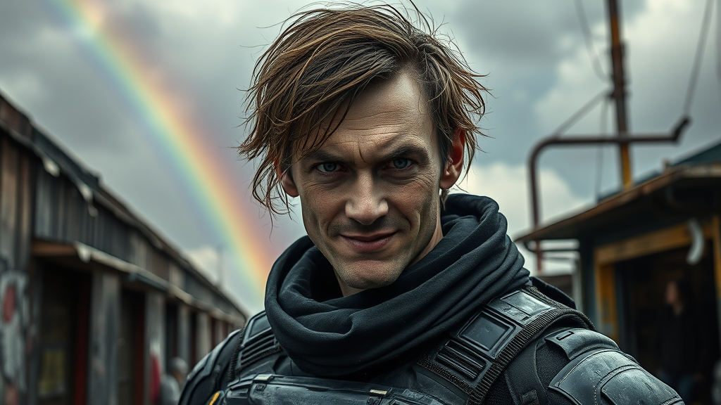 A technologically advanced soldier with a dark and furious demeanor stands in a stunning and stormy environment. With disheveled hair and clear, intense eyes tinged with pink, their gaze holds a gorgeous yet crazy focus. The soldier's smooth yet rugged features contrast with the absurdity of their surroundings, where a rainbow cuts through the storm clouds, adding a surreal touch. Despite the chaos, they manage a smile, albeit embarrassed by their sloppy appearance, with elements of surprise mingling with their anger. Ultra-realistic details capture the hyperrealism of the scene, where old paint peels from structures around them, and a sense of motion is blurred into the background. The bizarre imagery includes mutated limbs and extra fingers out of frame, adding to the absurdity and complexity of the photograph, revealing an environment as intriguing as it is unsettling.