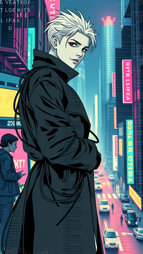 A Technomancer clad in a sleek black trench coat with intricate cable wires elegantly coiling around their arms, set against a vibrant cyberpunk cityscape illuminated by neon lights. This character embodies the futuristic essence of the year 2077, with biopunk elements seamlessly integrated into their design. The technomancer's striking symmetrical features are meticulously captured through precise line art. However, the image presents an intriguing contrast with intentionally low-resolution elements, interspersed with visual anomalies such as text fragments, JPEG artifacts, and pixelated distortions. The composition hints at an enigmatic narrative through its abstract portrayal, featuring blurred anatomy, unexpected formations, and artistic imperfections that evoke mystery and depth, complemented by a faded signature in the corner.