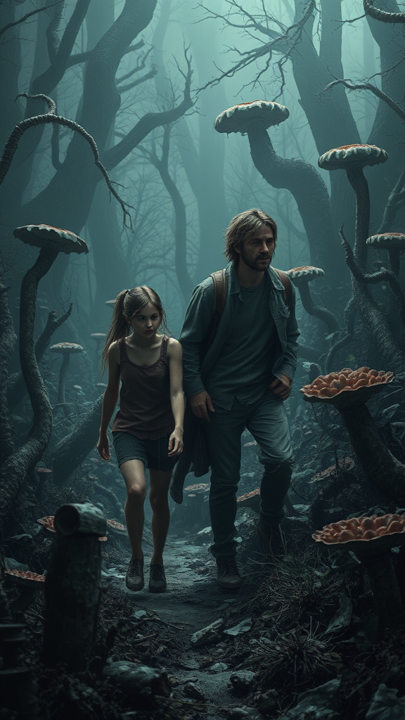 A teenage girl and an adult male navigate a detailed dystopian landscape reminiscent of The Last of Us, shrouded in dark, eerie lighting. The scene is overgrown with twisted vegetation and sinister fungal formations, capturing the essence of survival amidst decay. Styled in the artistic flair of Charlie Bowater and Gabrielle Ragusi, the composition highlights the intricate textures and atmospheric tension. The characters exhibit natural proportions, conveying determination and resilience without any exaggerated or misplaced anatomy, all in a vertical frame with an aspect ratio of 1:2.