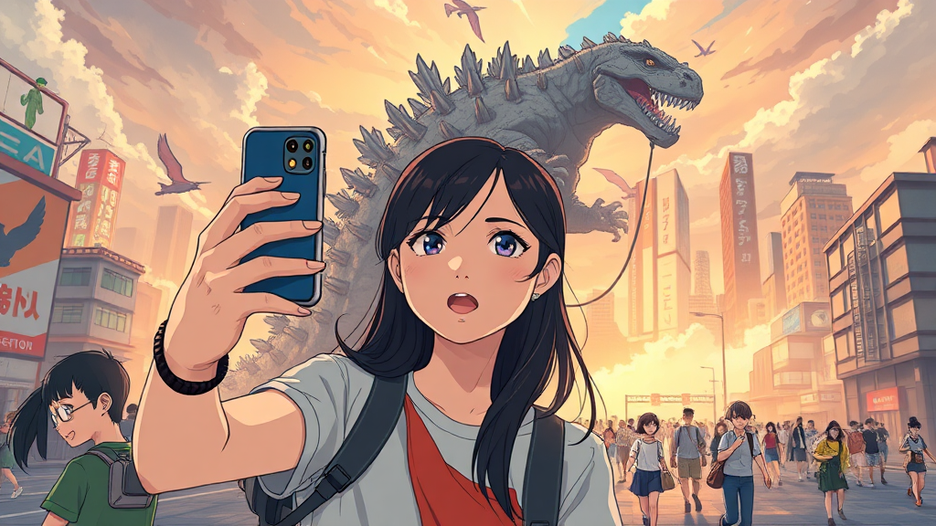 A teenage girl capturing a selfie with her phone, in the background a colossal Godzilla wreaks havoc in the cityscape, civilians fleeing in panic, photorealism meets whimsical art style by Beeple and Studio Ghibli, the scene exudes a surreal blend of chaos and calmness with vivid details --ar 2:3 --q 2 --v 5.