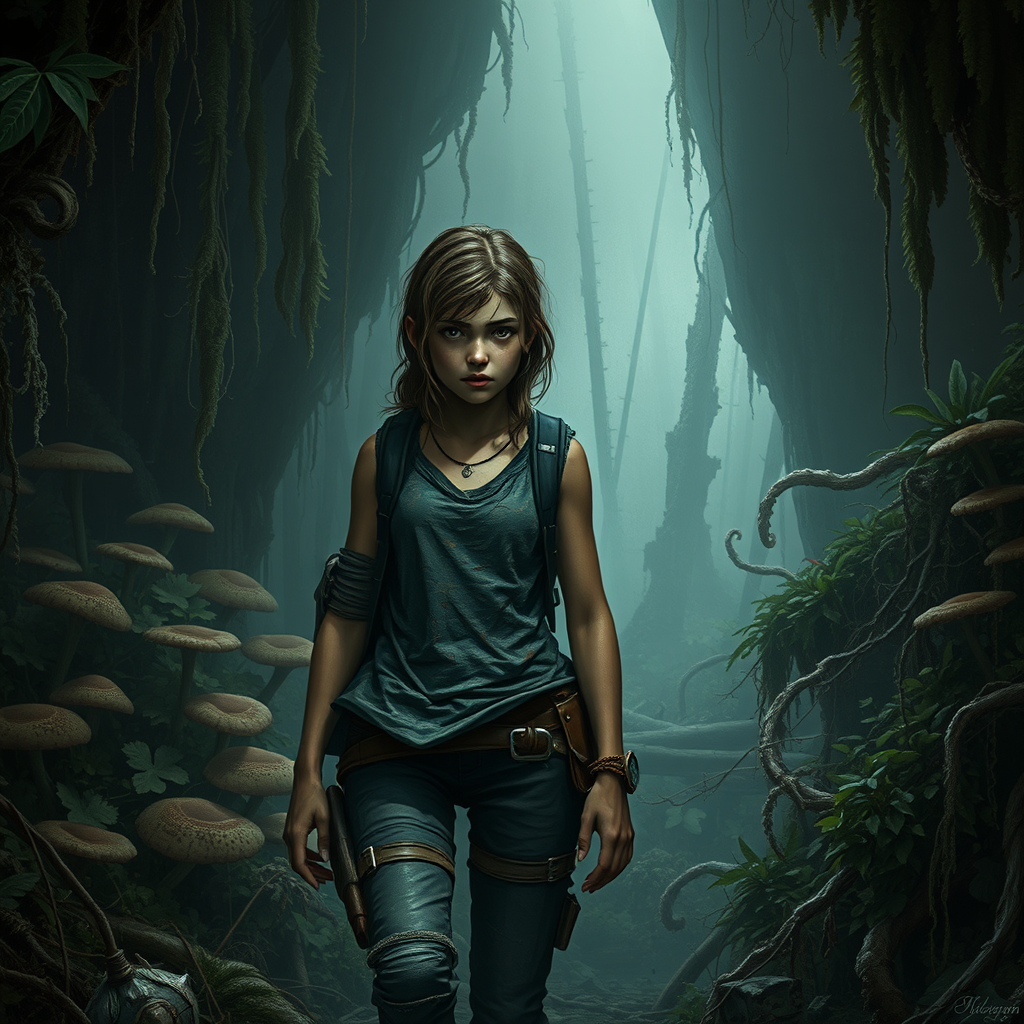 A teenage girl resembling Ellie from The Last of Us stands in a highly detailed dystopian scene, surrounded by overgrown vegetation and eerie remnants of a once-thriving world. The atmosphere is dark and haunted, with hints of fungal growth entwined with nature's reclaim. An adult male companion is by her side, both characters displaying resilience and determination. The style is reminiscent of Charlie Bowater and Gabrielle Ragusi, capturing the haunting beauty and intensity of the environment. The figures are depicted with accurate proportions, avoiding exaggerated features. The imagery conveys a sense of survival and hope amidst decay.