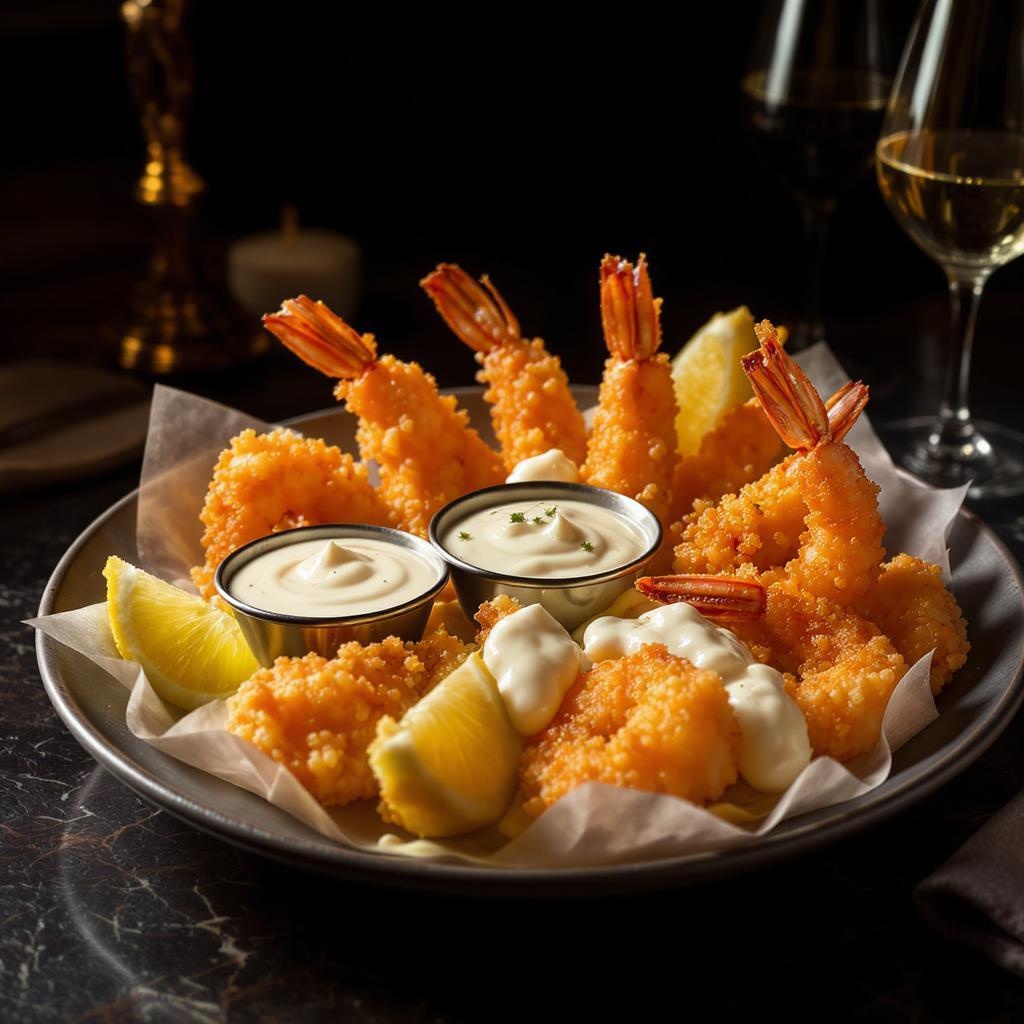 A tempting close-up shot captures a sumptuous gourmet fried shrimp platter with creamy tartar sauce, embodying high-end food photography. The composition is clean and centered, accentuating the elegant, mouth-watering indulgence of this luxurious dish. Dramatic, soft directional evening lighting casts enticing shadows across the scene, enhanced by the Nikon Z7 camera and a 105mm lens. The interior setting, curated by a skilled food stylist, adds a sophisticated touch to this expressive image.