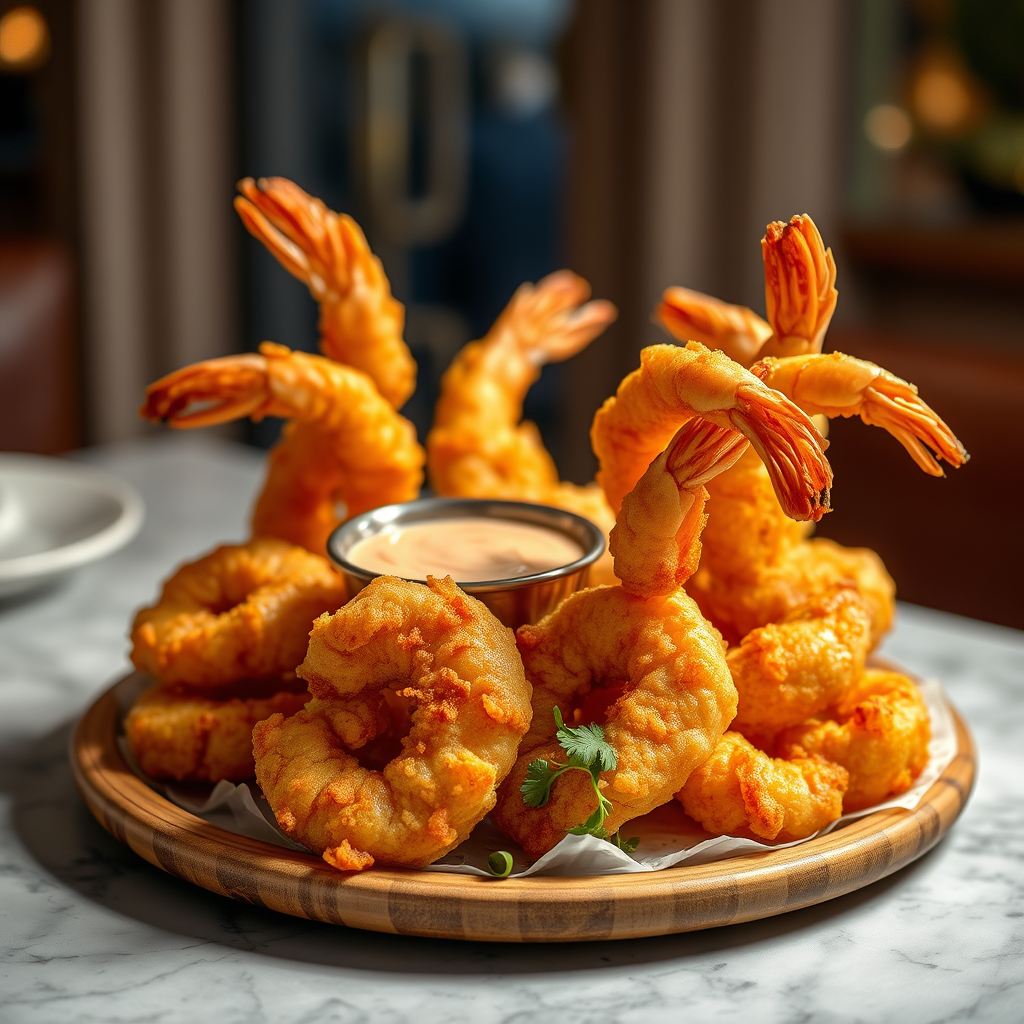 A tempting close-up shot of a gourmet fried shrimp platter, elegantly arranged with a side of rich tartar sauce. The high-end food photography captures clean composition with a luxurious and indulgent appeal. Dramatic lighting highlights the golden crispy texture of the shrimp against a softly lit interior setting. Shot on a Nikon Z7 at a focal length of 105mm, the composition is centered, with soft directional light adding to the evening ambiance of the scene. A food stylist has meticulously crafted this mouth-watering presentation, exuding an essence of opulence and culinary artistry.