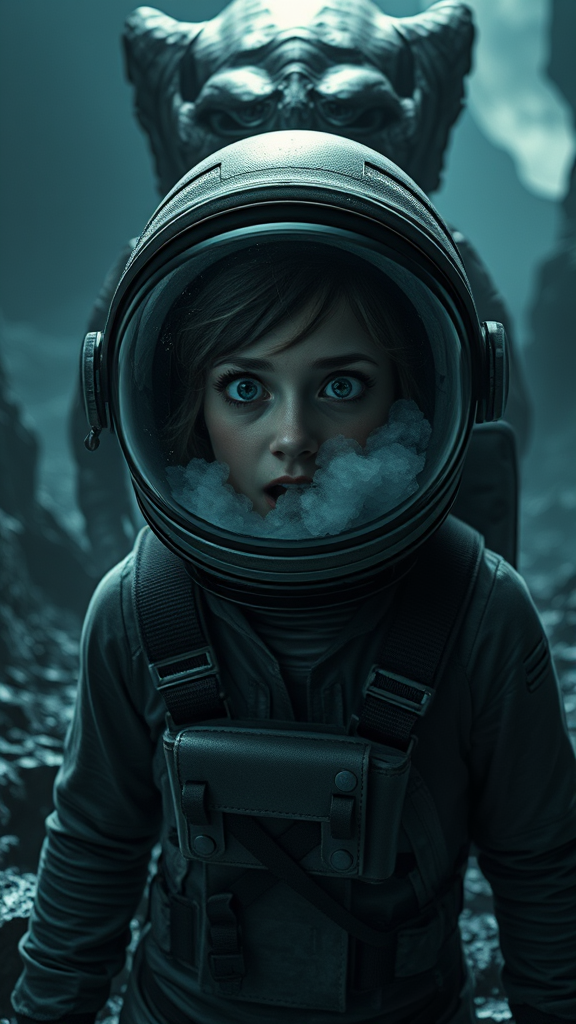 A terrified astronaut peers through the visor of her helmet, eyes wide with fear as a monstrous alien creature lurks menacingly behind her. She stands on the eerie landscape of a distant planet, shrouded in darkness and glistening with moisture. The alien world is a labyrinth of jagged rocks and shadowy crevices, where every sound echoes ominously in the thick, moist air. The astronaut's breath fogs up the inside of her helmet, her heart pounding as she slowly backs away, desperate to escape the nightmare unfolding in the sinister gloom of the alien realm.