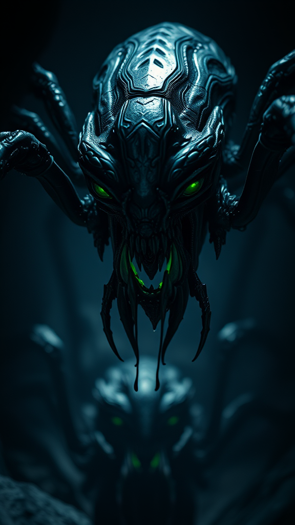 A terrifying alien entity resembling a humanoid spider, with glistening venom dripping from its fanged mouth, emerges ominously from the shadows of a foreboding cave. Its piercing green eyes, filled with deadly intent, glow hauntingly in the darkness. The creature's intricate body design boasts elaborate details that hint at a complex and menacing nature. Set in dramatic lighting that amplifies its horror, the scene is captured in stunning photorealism, exuding a cinematic atmosphere with a hint of grainy texture.