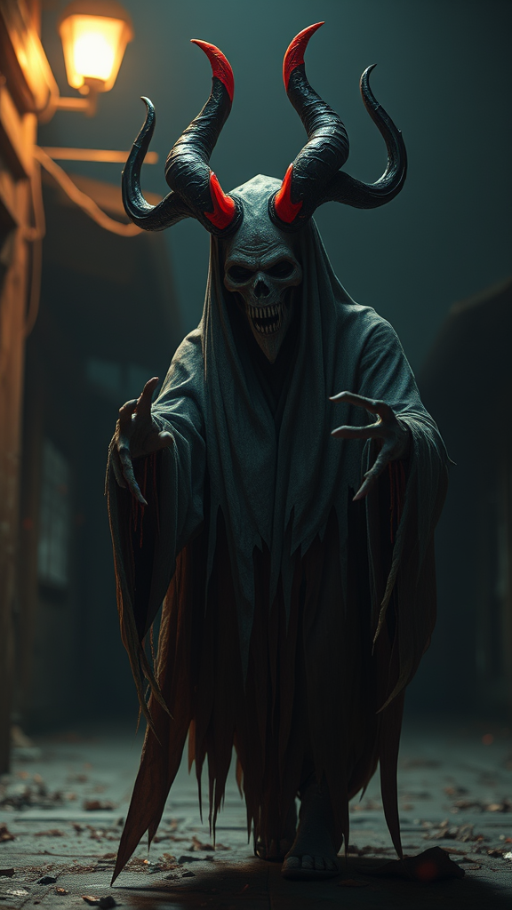 A terrifying and captivating Ghost Jinnat, Jinn, Demon, Ifrit, conjuring horror and enchantment in a haunted night setting, created with Unreal Engine 5. Cinematic and editorial photography style, utilizing a 70 mm lens for filmic quality, with an emphasis on depth of field and tilt shift blur. Shot at a shutter speed of 1/1000, F/22 aperture, optimal White Balance for intricate detail, captured in 32k Super-Resolution with Megapixel precision in ProPhoto RGB color space. Designed for high-end VR experiences and inspired by artists like Artgerm and Alex Ross, employing dramatic lighting techniques such as halfrear lighting, backlight, and natural incandescent moody lighting. The visual encompasses cinematic studio, soft, volumetric, and contre-jour lighting setups with dark and accent lighting for enhanced global illumination effects. Screen Space Global Illumination and Ray Tracing Global Illumination are pivotal, with red rim light and 45% cool color grading adding depth. The image features optics like scattering, glowing elements, rough and shimmering textures, encapsulated by Ray Tracing reflections and lumen reflections. Screen space reflections, diffraction grading, and chromatic aberration are applied alongside GB displacement, scan lines, Ray Tracing Ambient Occlusion, and advanced anti-aliasing (FKAA, TXAA, RTX, SSAO). Utilizing OpenGL, GLSL shaders, and extensive post-processing, the scene achieves a hypermaximalist, elegant, hyper-realistic, and super detailed finish with dynamic poses, centralized composition, and intense visual storytelling in CGI, VFX, and SFX.
