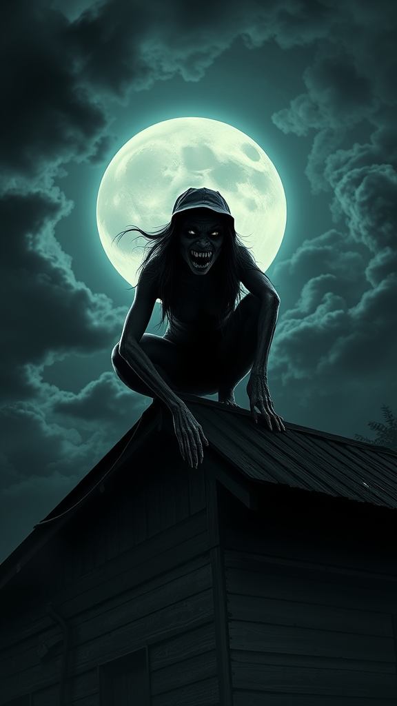 A terrifying Aswang, a grim and menacing female creature with sharp, glistening fangs, crouches ominously on the roof of a dilapidated house. The full moon casts an eerie glow behind her, silhouetting her haunting figure against a backdrop of swirling, dark clouds. Her eyes gleam with a sinister intelligence, reflecting the macabre essence of Philippine folklore. The scene captures the chilling atmosphere of horror, rendered in exquisite hyperrealism with intricate details that blur the line between reality and nightmare. The surrounding landscape is shadowy and foreboding, enhancing the spectral ambiance. The image is crafted in ultra-high definition, 8k quality, using unreal engine for a lifelike 3D rendering, and carries a distinct expressive style that conveys the folklore's enigmatic terror.