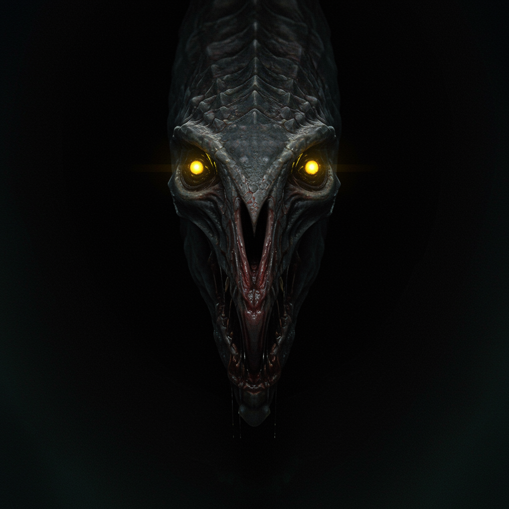 A terrifying beast lurks in the shadows, its flat snout sniffing the air with menacing intent. Piercing yellow eyes glow with an eerie luminosity, casting an unsettling light that penetrates the darkness. The creature's form is hauntingly detailed, every sinew and scale rendered with hyperrealistic precision that captivates and chills the soul. As if drawn from a nightmarish realm, the scene is presented with breathtaking clarity at 8k resolution, emphasizing the ultra-detailed intricacies that make this horror both captivating and profoundly unsettling, set against a narrow, vertical aspect ratio that amplifies its sinister presence.