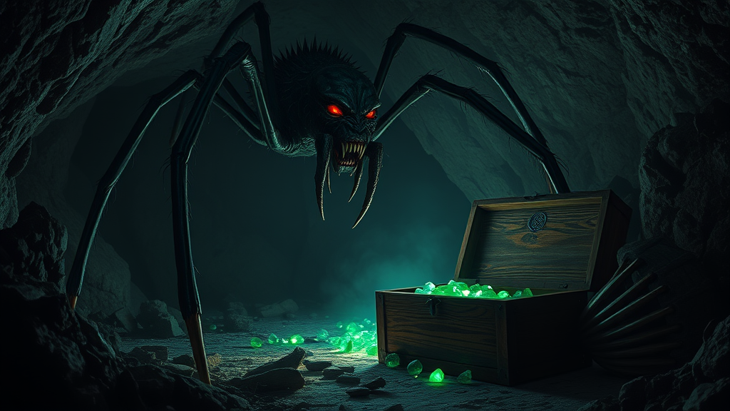 A terrifying creature resembling a giant spider with elongated limbs and sharp fangs, its body covered in wiry, chitinous hair, glistening faintly in the dim light. The creature's eyes are a piercing, luminescent red, casting an eerie glow across the jagged walls of the cavern. In the shadowy depths of the cave, an ancient, weathered wooden chest lies open on the stony ground, overflowing with glistening emeralds that catch the creature's gaze. The scene is shrouded in a chilling atmosphere, with intricate details revealing the texture of the cave walls and the slender, menacing form of the spider-like monster. This cinematic 4k fantasy-style image captures the haunting allure and creeping dread of the moment.