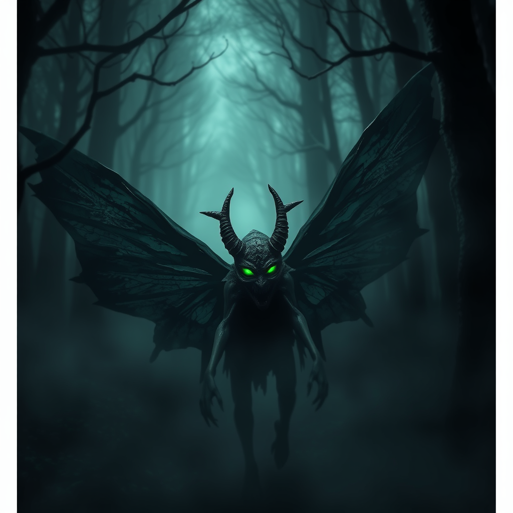 A terrifying dark fairy with sinister wings lurks in the eerie woods, its menacing green eyes glowing ominously through the thick, swirling fog. With its demonic and unholy presence, this ghastly creature exudes an unsettling aura of horror. The scene is drenched in dramatic, shadowy lighting that accentuates the intricate and detailed design of the fairy's ghoul-like features. The atmosphere is cinematic and photorealistic, capturing the nightmare in stunning 8k resolution.