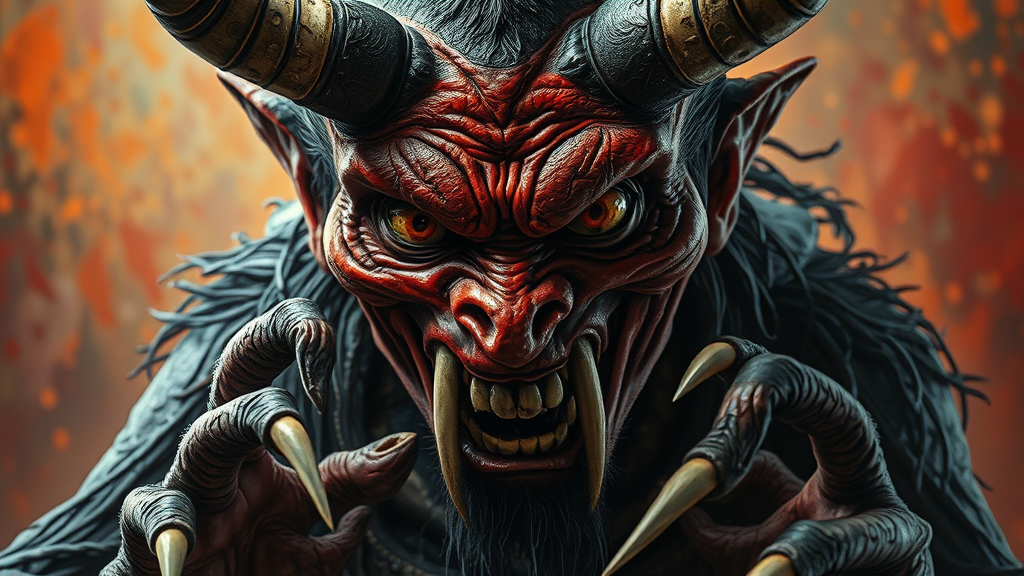 A terrifying depiction of an evil oni with a nightmarish appearance, inspired by Japanese Oni culture, portrayed in a highly detailed, hyperrealistic style with splash and concept art elements. The scene captures the essence in a mid shot, showcasing intricately detailed features with deep color depth and a dramatic 2/3 face angle. Lit from the side to enhance the shadows, the colorful background contrasts with the oni's unsettling features. The creature exhibits misplaced limbs and distorted anatomy, with a disfigured and deformed face that appears nightmarishly ugly. Its mismatched eyes and crooked lips add to the horror, framed out of focus to create a grim atmosphere. Despite the chaotic composition, there's a haunting allure to its grotesque beauty, intensified by the strange body positions and mutations. The portrait evokes discomfort with its plastic-like, imperfect likeness, while subtle artistic modifications ensure that the essence of this unsettling oni remains intact amidst its imperfections and distortions.