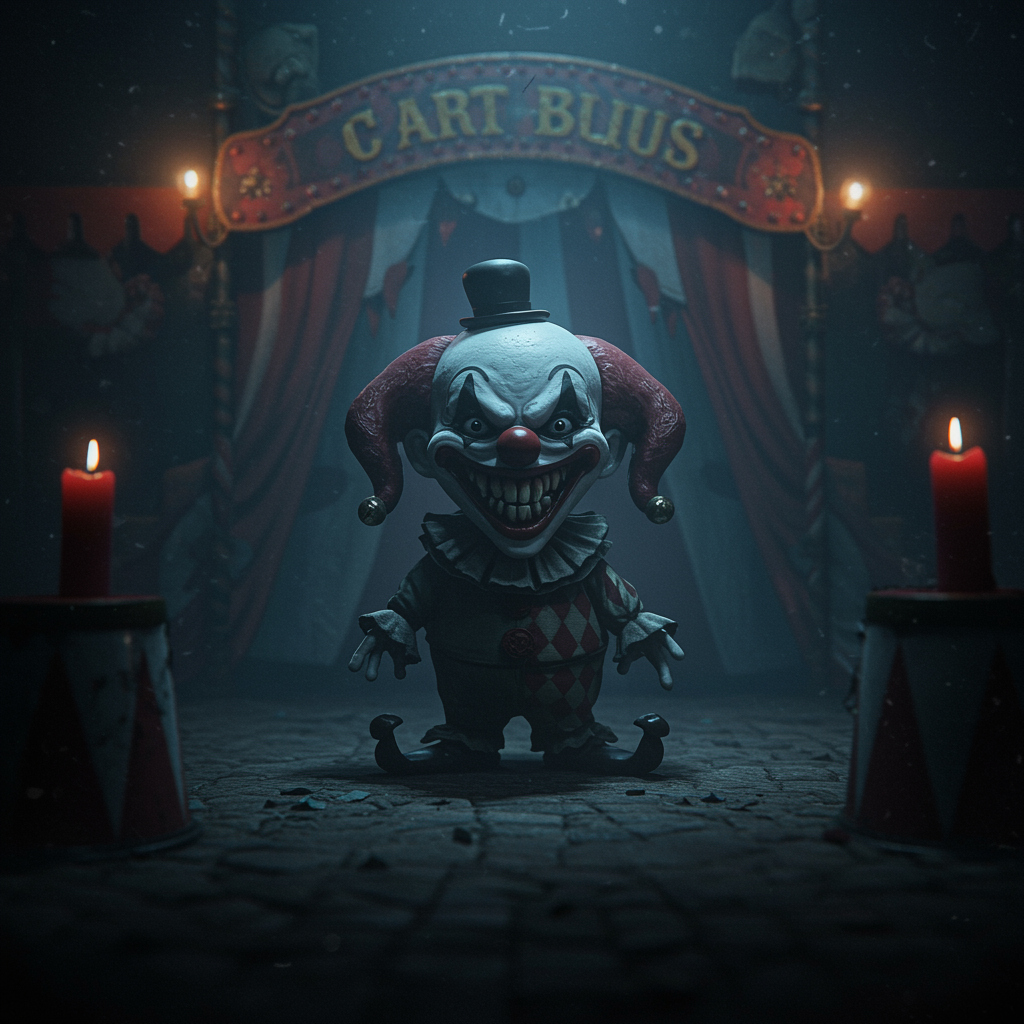 A terrifying diminutive clown with a sinister, wide grin lurks in the shadows of a macabre circus, surrounded by an unsettling atmosphere. The eerie ambiance is amplified by intricate designs and elaborate details, illuminated by dramatic, haunting lighting. The scene is captured in a photorealistic, cinematic style with a grainy texture, creating an intense and immersive experience, presented in ultra-high definition for maximum impact.