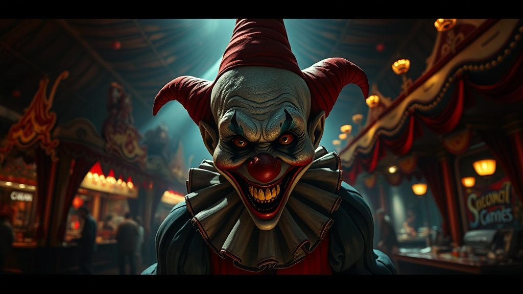 A terrifying dwarf clown with a sinister smile lurks in a dimly lit macabre carnival, surrounded by eerie attractions and twisted performances, evoking a sense of horror and dread. The circus is filled with intricate designs and unsettling details, casting ominous shadows under dramatic cinematic lighting that accentuates the clown's ghastly features. The photorealistic scene captures a haunting atmosphere with cinematic noise, presented in stunning 8k resolution, drawing viewers into this chilling and otherworldly spectacle.