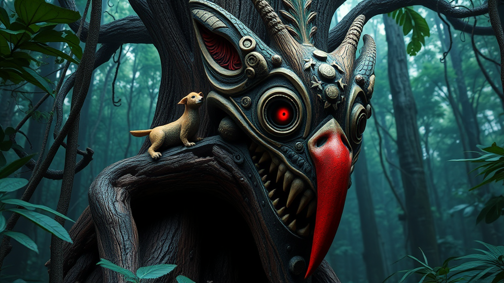 A terrifying, intricately detailed wood creature with a singular glowing red eye, emerging from the depths of a shadowy jungle. Crafted in the style reminiscent of Filip Hodas and Natalia Rak, this eerie being blends hyper-realistic textures with vibrant, colorful woodcarvings. Its form echoes anthropological folklore, adorned with characterful animal motifs and a haunting Lovecraftian presence. The creature appears rooted to a tree, which houses a sinister man with a stark red nose, evoking an unsettling presence among the dense forest. Rendered with ZBrush influence and Daz3D finesse, every detail is crisply brought to life in stunning 32k UHD, creating a masterpiece that seamlessly intertwines the mysterious allure of a hidden forest and the vivid imagination of intricate sculpture.
