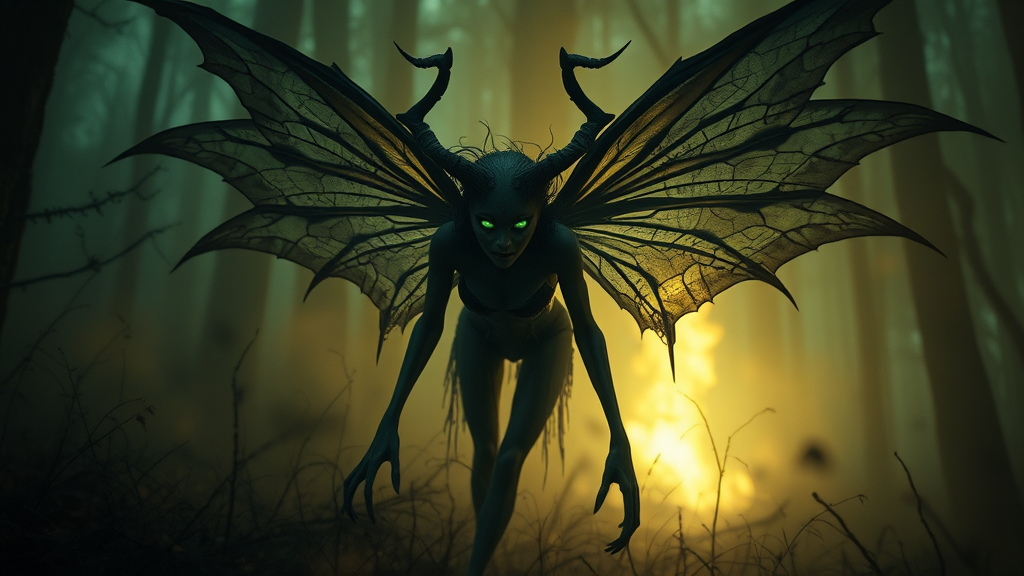 A terrifying malevolent fairy with tattered wings lurks in the shadowy woods, her piercing, emerald eyes glowing ominously through the fog. The atmosphere is demonic and unholy, dripping with dread. Her form is adorned with intricate, eerie patterns, exuding a chilling horror. The scene is enveloped in dramatic, eerie lighting, capturing a photorealistic, cinematic tension. The fairy seems almost ethereal yet terrifyingly real, set within an immersive 8k landscape, emphasizing the dark and haunting ambiance.