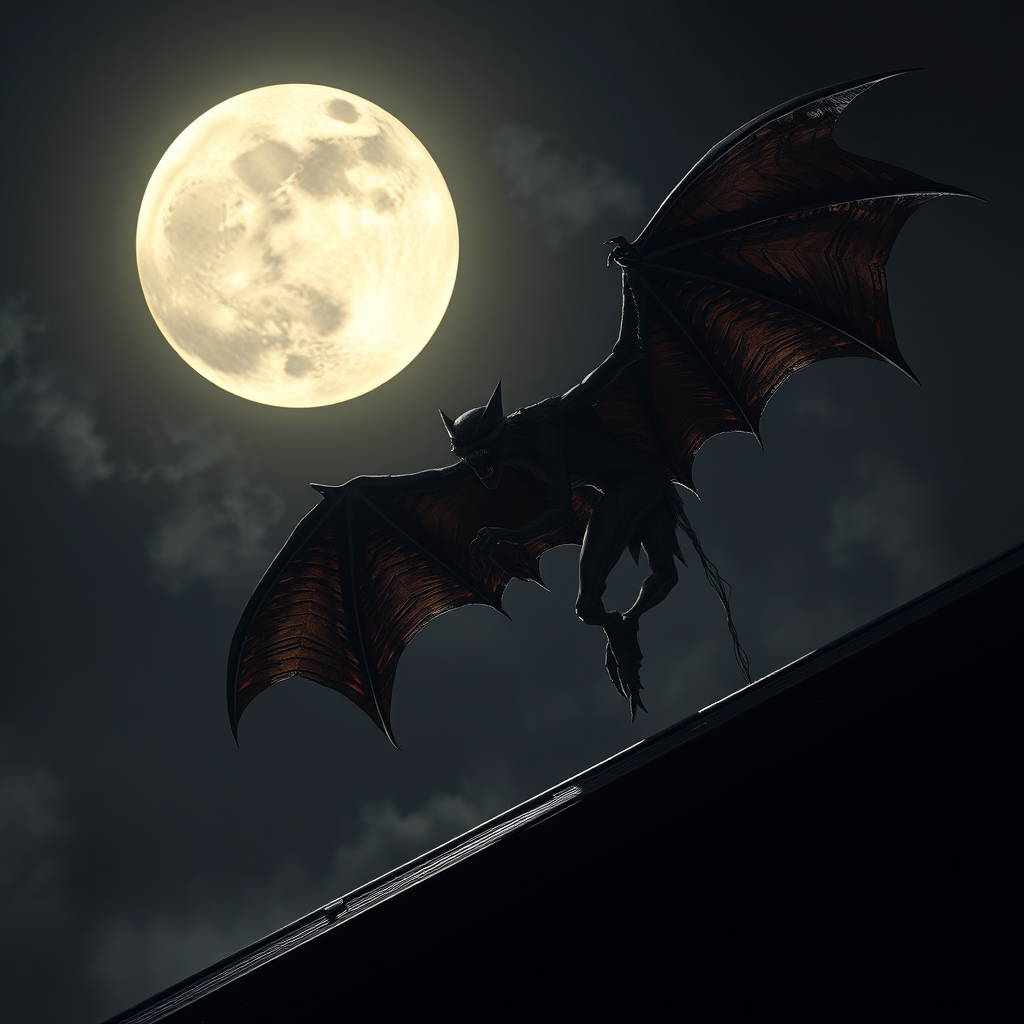 A terrifying Manananggal, a female monster with a grotesque half-body and large, leathery bat wings, soars menacingly near the edge of a shadowy rooftop. Her sharp fangs glisten in the eerie glow of a full moon that casts ghostly shadows across the night, creating a chilling contrast against the dark skies. This scene captures the essence of horror and folklore with a hyperrealistic, photorealistic 8k rendering, using advanced 3D rendering techniques for a nightmarish sense of realism. The setting is steeped in the macabre themes of Philippine folklore, with an unsettling, expressive style that heightens the haunting atmosphere, blending traditional horror with a modern, unreal engine aesthetic.