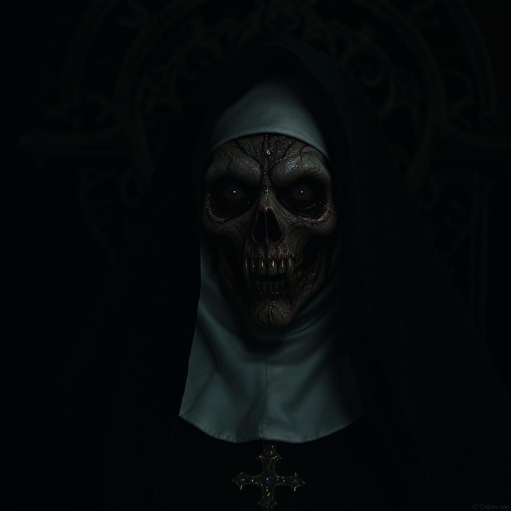 A terrifying nun shrouded in darkness, with unsettling, unholy features that exude an air of creeping horror; her face a ghastly visage, surrounded by intricate, gothic designs and details that whisper of malevolence. The scene is captured with dramatic, shadowy photography lighting, bringing out the photorealistic, cinematic quality of this dark apparition in stunning 8k detail -- a vision crafted to haunt and fascinate.