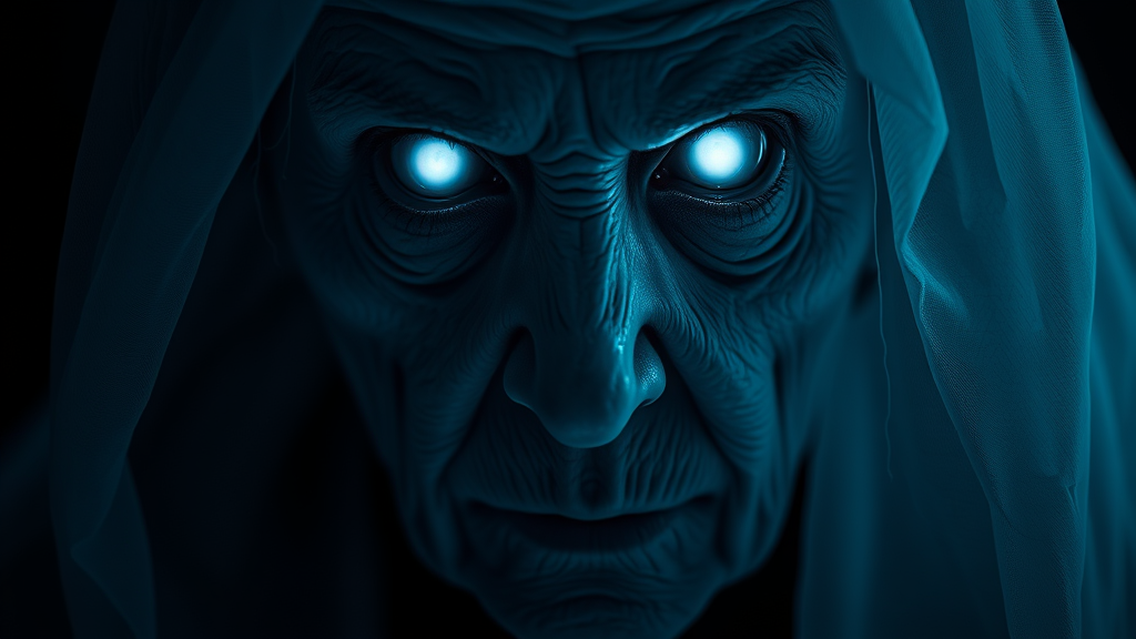 A terrifying spectral figure of an aged woman materializes in the darkness, her glowing white pupil-less eyes piercing through the void, casting an unsettling gaze. Her face is eerily illuminated by an ethereal blue-grey light, emphasizing every wrinkle and crevice in hyperrealistic detail. The close-up view captures her haunting expression, projecting a sense of imminent dread. This nightmarish apparition, enveloped in a chilling, otherworldly presence, is rendered with ultra-detailed precision, capturing every haunting feature in dramatic 8k resolution, set against an infinite black background, creating a spine-tingling horror scene.