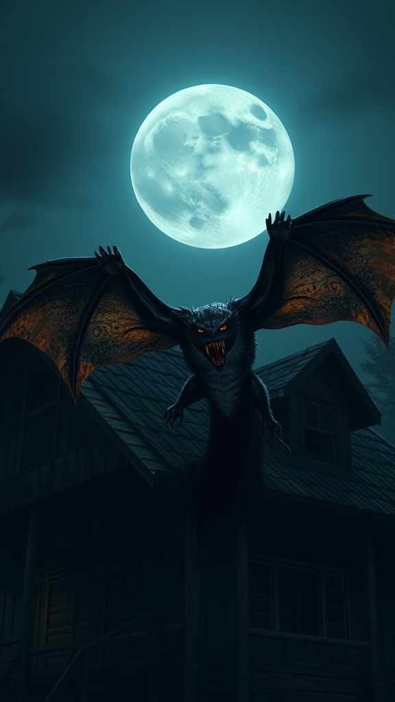 A terrifying Tiktik, a female monster with leathery bat-like wings and sharp glistening fangs, hovers ominously near the roof of an old, creaking house. The full moon casts an eerie glow, illuminating her sinister silhouette against the dark, starless sky. The atmosphere is haunting, thick with dread, capturing the essence of Philippine folklore. The scene is depicted in hyperrealism with photorealistic detail, rendered in stunning 8k resolution using Unreal Engine, evoking a sense of macabre horror. The composition is cinematic in scope, with an expressive, chilling style and dynamic tension that draws the viewer in.
