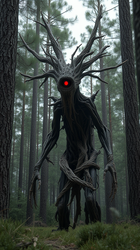 A terrifying wood creature emerges with a single, ominous red eye, seamlessly blending into the dense pine forest. Its body, a tapestry of twisted branches and bark, resonates with the immersive style akin to Filip Hodas and Daz3D. The creature stands among towering trees, its presence a mystical intrusion in the landscape, evoking the quirky narrative style of Sandy Skoglund and Natalia Rak, captured in hyper-realistic detail akin to Maya's rendering prowess. Its organic, nature-inspired form reflects an anthropological marvel, reminiscent of frogcore aesthetics, whispering tales from ancient storybooks. The close-up reveals intricate textures of wood and foliage, a surreal fusion of the mythical and the natural.