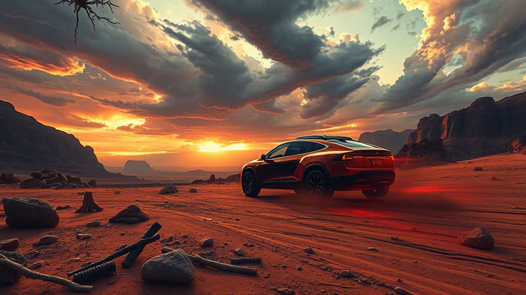 A Tesla Cybertruck navigating the rugged Martian landscape under a dramatic, otherworldly sky, captured with cinematic lighting in stunning 4k resolution, as if seen through a 50mm lens. The scene evokes a sense of adventure and exploration, with creative brushwork reminiscent of a painting by an unconventional artist, blending realism with imaginative elements.