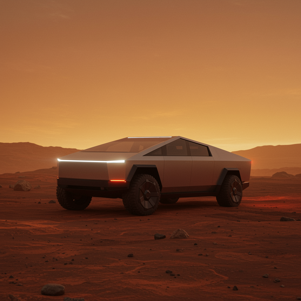 A Tesla Cybertruck parked on the red, rocky terrain of Mars under the dramatic glow of a setting sun, casting long shadows across the alien landscape, captured in ultra-high-definition 4k quality through a 50mm lens. The scene evokes a sense of quiet isolation and futuristic exploration, with the intricate details of the truck contrasted against the surreal Martian horizon, reminiscent of a painting by an avant-garde artist.