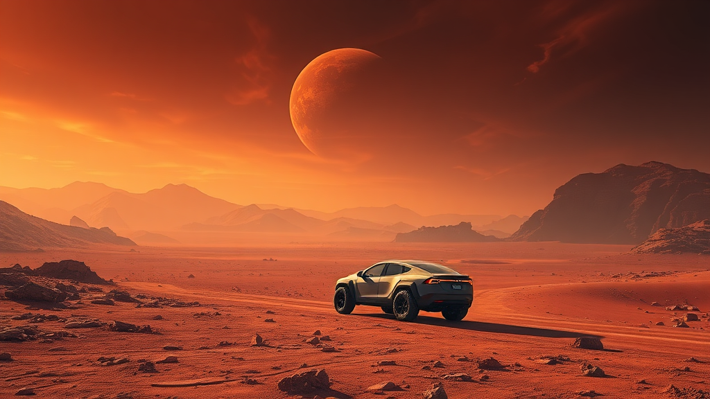 A Tesla Cybertruck traverses the rugged Martian landscape under a dramatic, otherworldly sky. The scene is captured in stunning 4K resolution with a 50mm lens, highlighting the vehicle's futuristic design against the barren, red terrain. Warm, cinematic lighting casts long shadows, creating an atmosphere of mystery and adventure. The image, reminiscent of a painting by an avant-garde artist, combines crisp realism with abstract elements, capturing the essence of exploration and innovation on a distant planet.