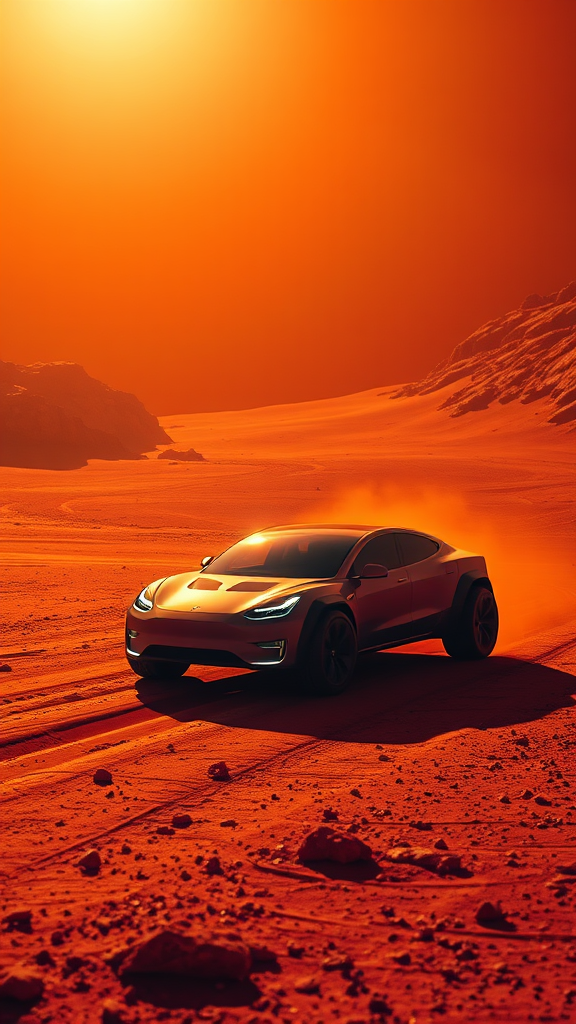 A Tesla Cybertruck traversing the Martian landscape under a dramatic cinematic glow, captured in ultra-high-definition 4k with a 50mm lens. The scene exudes a surreal quality, reminiscent of an artwork by an avant-garde artist, the vehicle's sleek metallic form contrasting with the crimson dust of Mars, as luminous shadows play over its surface, evoking a sense of futuristic exploration.