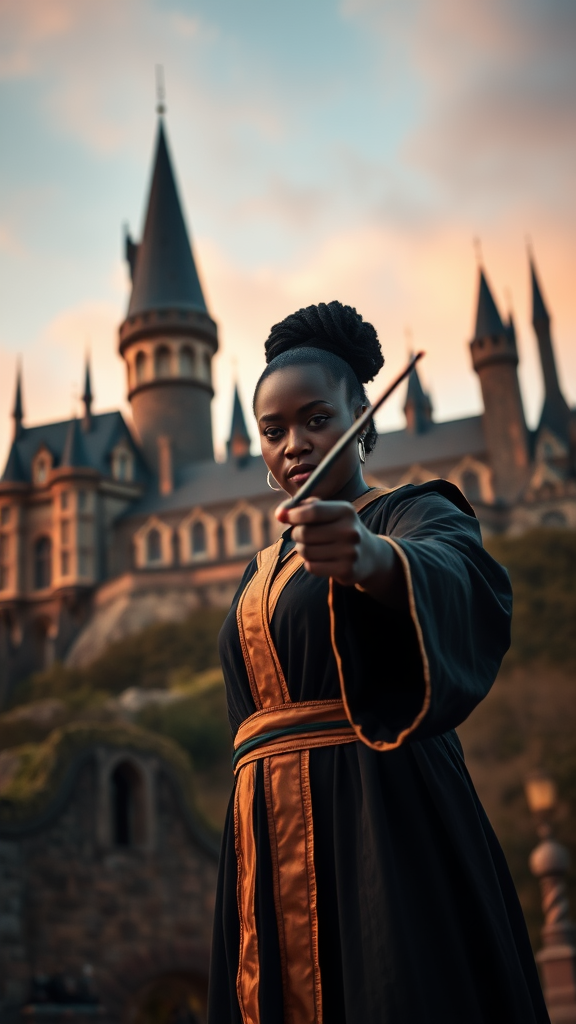 A thick 30-year-old African American woman, elegantly poised in front of the majestic Hogwarts School of Witchcraft and Wizardry, skillfully practices the Dark Arts with her wand. The cinematic wide shot captures the beautiful castle in the background, while she stands in the foreground, her focus entirely on her glowing wand. Dressed in a black and gold Hogwarts robe, her expression is intense, suggesting she is casting a powerful spell with determination to protect her students from an impending threat. Directed by Ryan Coogler, the scene is inspired by the Harry Potter universe, showcasing her precise and graceful wand movements, honed through years of discipline. The golden hour bathes the scene in warm light, casting a muted blend of blue and purple hues that enhance the magical ambiance. Her passion for magic radiates through every move, and she stands ready to confront the challenges of the Dark Arts with unwavering resolve. In the background, Hogwarts looms majestically, symbolizing the rich history and tradition of the wizarding world, while the woman's concentration and commitment shine brilliantly in the scene.