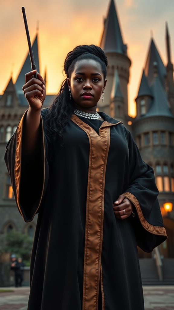 A thick 30-year-old African American woman stands resolutely in front of Hogwarts School of Witchcraft and Wizardry, practicing the Dark Arts with her wand. The wide shot captures the majestic Hogwarts castle bathed in golden hour light, providing a stunning backdrop to her focused, spell-casting stance. She wears an elegant black and gold Hogwarts robe, her wand hand raised and glowing with magical energy. Her intense expression reveals a commitment to mastering her spells to protect her students from an impending threat. Her wand movements are precise and graceful, a testament to years of dedicated practice. The muted colors of the scene are tinged with mystical blues and purples, enhancing the magical atmosphere. Her determination and passion for magic shine through her every move, unafraid of delving into the Dark Arts. Hogwarts looms grandly behind her, a reminder of the rich history and tradition of the wizarding world.