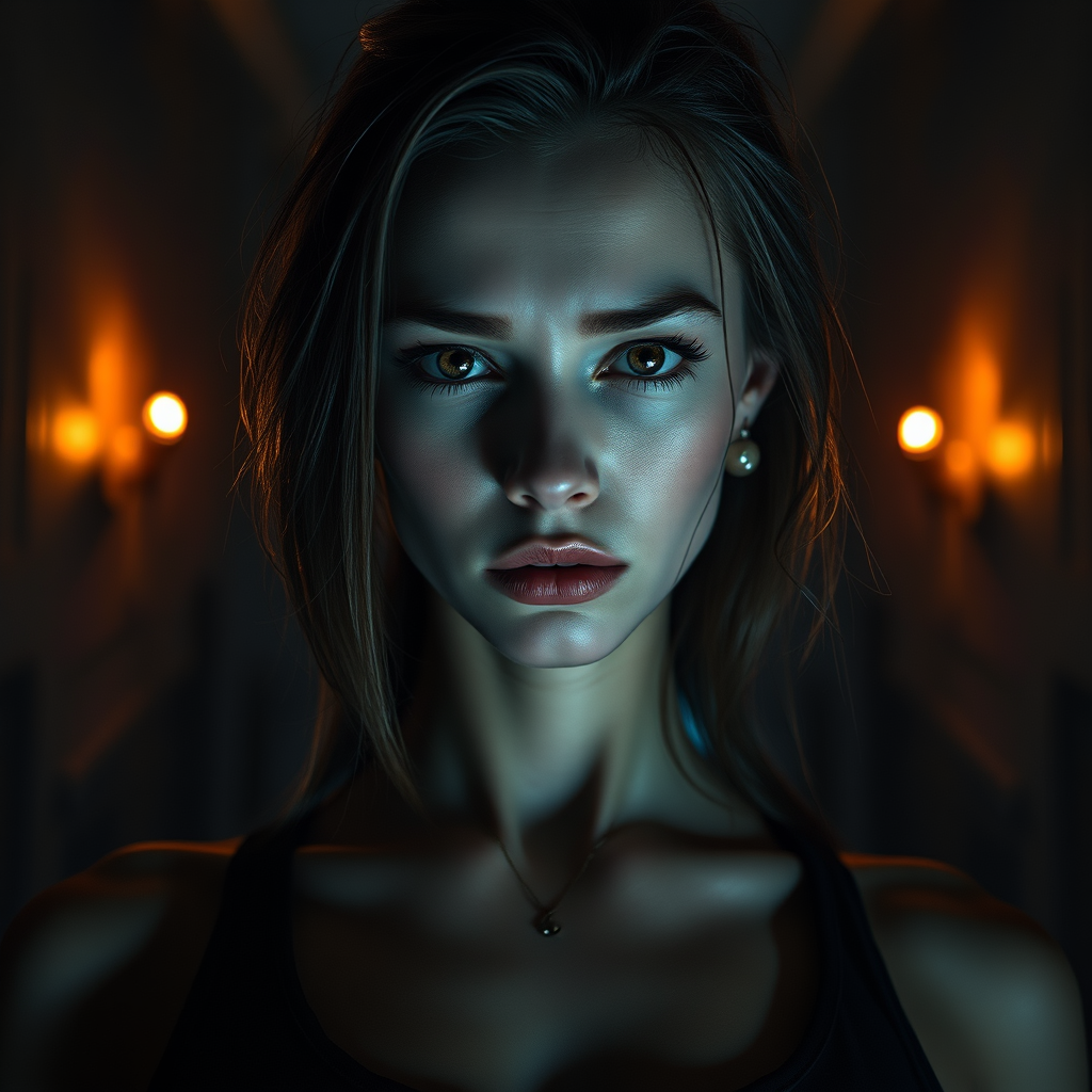 A three-quarter close-up portrait capturing a stunningly beautiful 30-year-old woman with a slender and athletic figure, characterized by a striking face and frowning yet innocent expression, set against an oppressive and contrasting background. The scene is infused with dramatic backlighting emanating from within, enhancing the gloomy and crushing horror atmosphere. Captured from below with a DSLR, the cinematic shot features an aperture of f/7, shutter speed 1/100 sec, and ISO 150. The image is rendered in super detailed and hyper photorealistic style, showcasing natural reflections and cinematic anime lighting, with textures highlighting her features. The portrayal excludes any deformed, morbid, or duplicated elements, focusing on symmetry and precision without blurring or low-quality artifacts. It emphasizes clarity, proportionate anatomy, and a well-composed frame, ensuring everything is in place to create a powerful and cohesive visual narrative.
