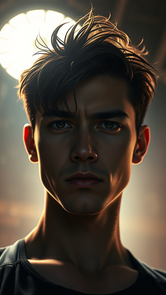 A three-quarter close-up portrait featuring a 30-year-old man with a slender athletic build and a stunning face, showcasing a frowning yet innocent expression. His hair is styled dramatically against an oppressive and contrasting background that evokes a sense of looming horror with a crushing atmosphere. The scene is captured as a cinematic shot from below using a DSLR, with an aperture of f/7, shutter speed of 1/100 sec, and ISO 150. The image is super detailed with hyper photorealistic quality, highlighting natural reflections and dramatic cinematic lighting reminiscent of anime. The background is characterized by a blinding bright light that contrasts with the eerie surroundings. Clarity is maintained, focusing on symmetry and avoiding any distortions such as deformations or poor anatomy, ensuring a crisp, high-quality representation without any extraneous elements like extra limbs, disfigured features, or blurred details.
