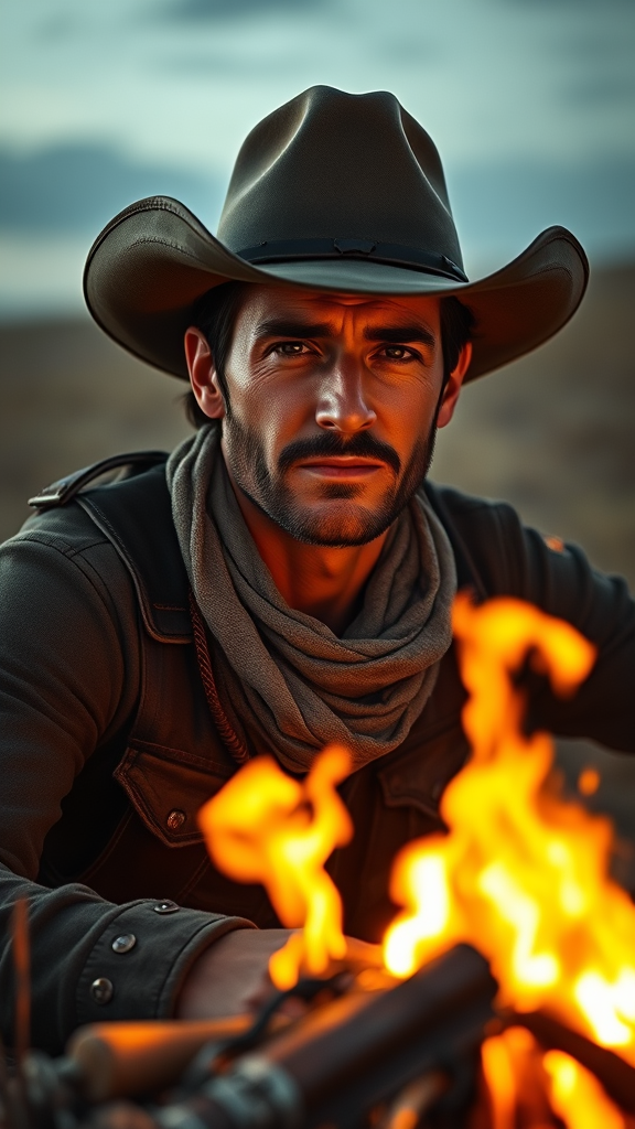 A three-quarter close-up portrait of a 28-year-old cowboy sitting by a campfire on the prairie, exuding the essence of the western frontier. The image captures a key visual with breathtaking beauty and comprehensive cinematic quality. Rendered with ultra-sharp focus, the scene is highly detailed and anchored in best quality visuals. The background subtly features a borderlands girl with nuanced lighting, gold accents, and artistic flair, avoiding any elements of distortion or poor quality. The cowboy's expression is vivid and lifelike, set against a backdrop free of distractions and imperfections, embodying both strength and solitude in the expansive landscape.
