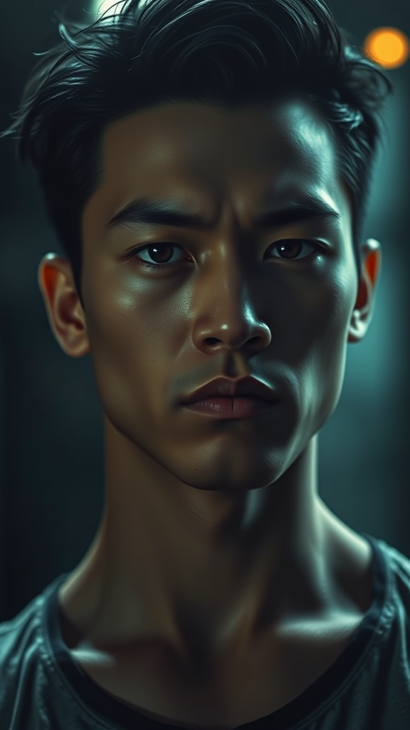 A three-quarter close-up portrait of a 30-year-old man with a slender, athletic build and a captivating face, displaying a frowning yet innocent expression. His hair is styled in a dramatic fashion. The background is oppressive and contrasting, adding to the intense atmosphere with dynamic lighting from within. The scene captures a cinematic shot from a low angle, using a DSLR with an aperture of f/7, shutter speed of 1/100 sec, and ISO 150. The image is super detailed and hyper photorealistic, showcasing natural reflections, cinematic anime-style lighting, and a sense of symmetry. The atmosphere is filled with tension and a gloomy, horror-like ambience, creating a striking visual impact.