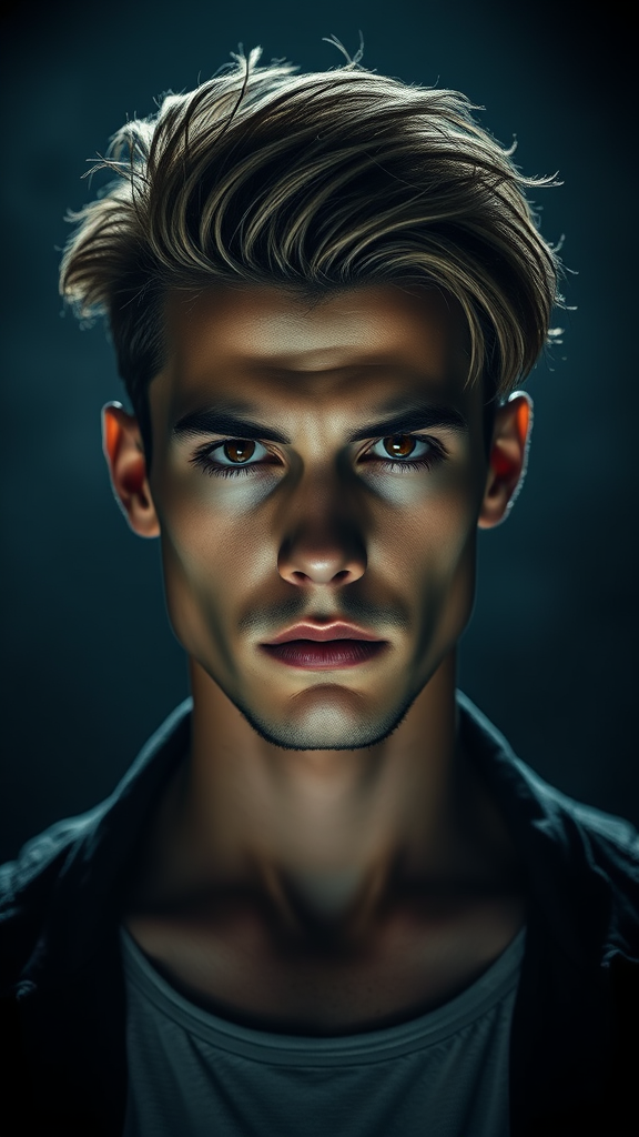 A three-quarter close-up portrait of a 30-year-old man with a slender athletic build and a striking face, displaying a frowning yet innocent expression. His hair is styled with attention to detail. He stands against an oppressive, contrasting background, illuminated by backlighting from within, creating a dramatic, expressive atmosphere. The scene conveys a gloomy, horror-infused ambiance. This cinematic shot is captured from a low angle using a DSLR camera with an aperture of f/7, a shutter speed of 1/100 sec, and an ISO of 150. The image is super detailed and hyper-realistic, showcasing natural reflections and cinematic anime lighting. The composition is symmetrical, emphasizing the manβs enigmatic presence amidst an intense and haunting setting.