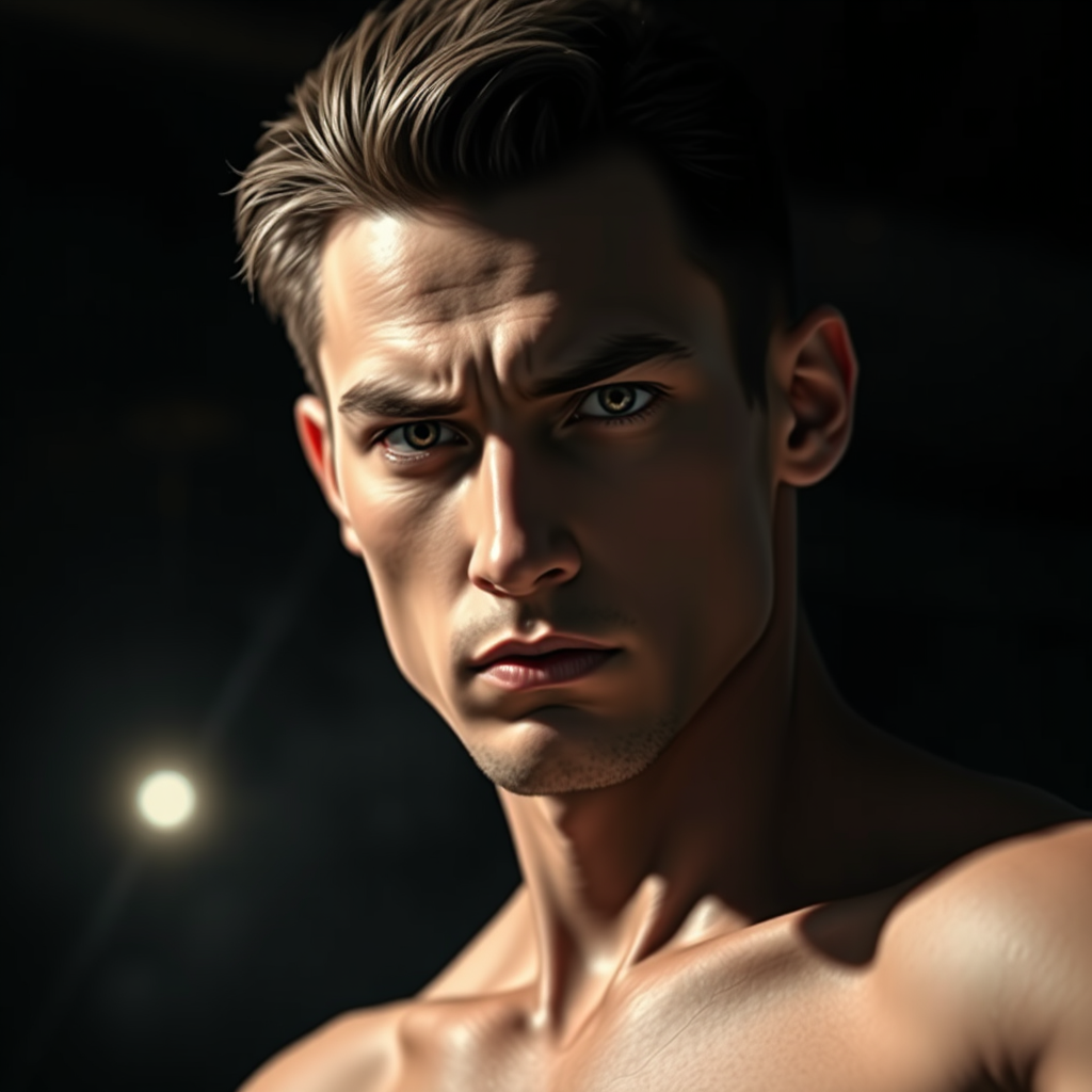 A three-quarter close-up portrait of a 30-year-old man with a slender, athletic build and a striking face. He has a frowning but innocent expression and well-groomed hair. The background is heavy, contrasting, and oppressive, with dramatic, expressive elements that convey a gloomy, horror-infused atmosphere. The scene is backlit from within, creating a cinematic feel. Photographed from a low angle using a DSLR camera, with an aperture of f/7, a shutter speed of 1/100 sec, and ISO 150. The image is incredibly detailed and hyper-photorealistic, capturing the natural reflections and cinematic lighting inspired by anime. Despite the intense setting, the lighting is bright and almost blinding, emphasizing the symmetry and intricacies of the scene. The composition intentionally excludes any unrealistic, grotesque, or poorly rendered features, such as deformities or disfigurements, ensuring a focus on the intense emotional and visual impact.