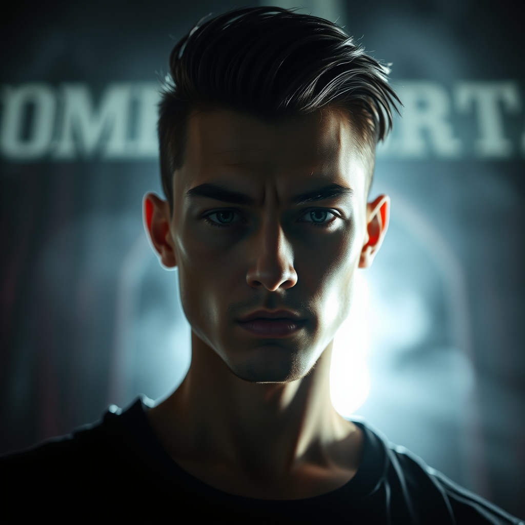 A three-quarter close-up portrait of a 30-year-old man with a slender, athletic build and a captivating face, displaying a frowning yet innocent expression. His hair is meticulously styled, with oppressive and contrasting background elements that create a dramatic and expressive atmosphere. The setting has a gloomy, horror-inspired feel with a cinematic shot captured from a low angle using a DSLR, set at an aperture of f/7, shutter speed 1/100 sec, ISO 150. The image is super detailed and hyper-photorealistic, with textures of natural reflections. Cinematic anime-style lighting and intense backlighting add depth, while the scene is imbued with bright, almost blinding light that highlights rivets and symmetry. The overall composition excludes unwanted elements such as deformed anatomy, blurred details, and unwanted duplications, maintaining a focus on quality and detail.
