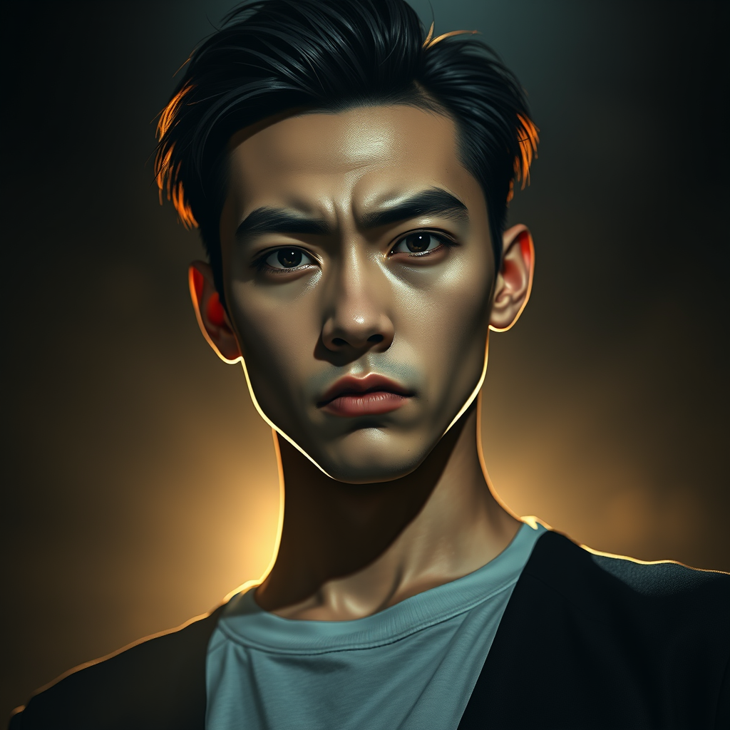 A three-quarter close-up portrait of a 30-year-old man with a slender, athletic build and a striking face, displaying a frowning yet innocent expression. His hair is styled with precision. The background is oppressive and contrasting, creating a dramatic and expressive atmosphere with backlighting that adds a sense of gloom and horror. The scene is captured with cinematic flair, photographed from a low angle using a DSLR, with an aperture of f/7, shutter speed of 1/100 sec, and ISO 150. The image is hyper-detailed and photorealistic, showcasing natural reflections and cinematic anime-inspired lighting. Elements of bright, blinding light and symmetrical textures add depth, while maintaining a focus on anatomical accuracy, avoiding any deformities or disfigurements. The resulting portrait is intense and captivating, with meticulous attention to the character's expression and the atmospheric background.
