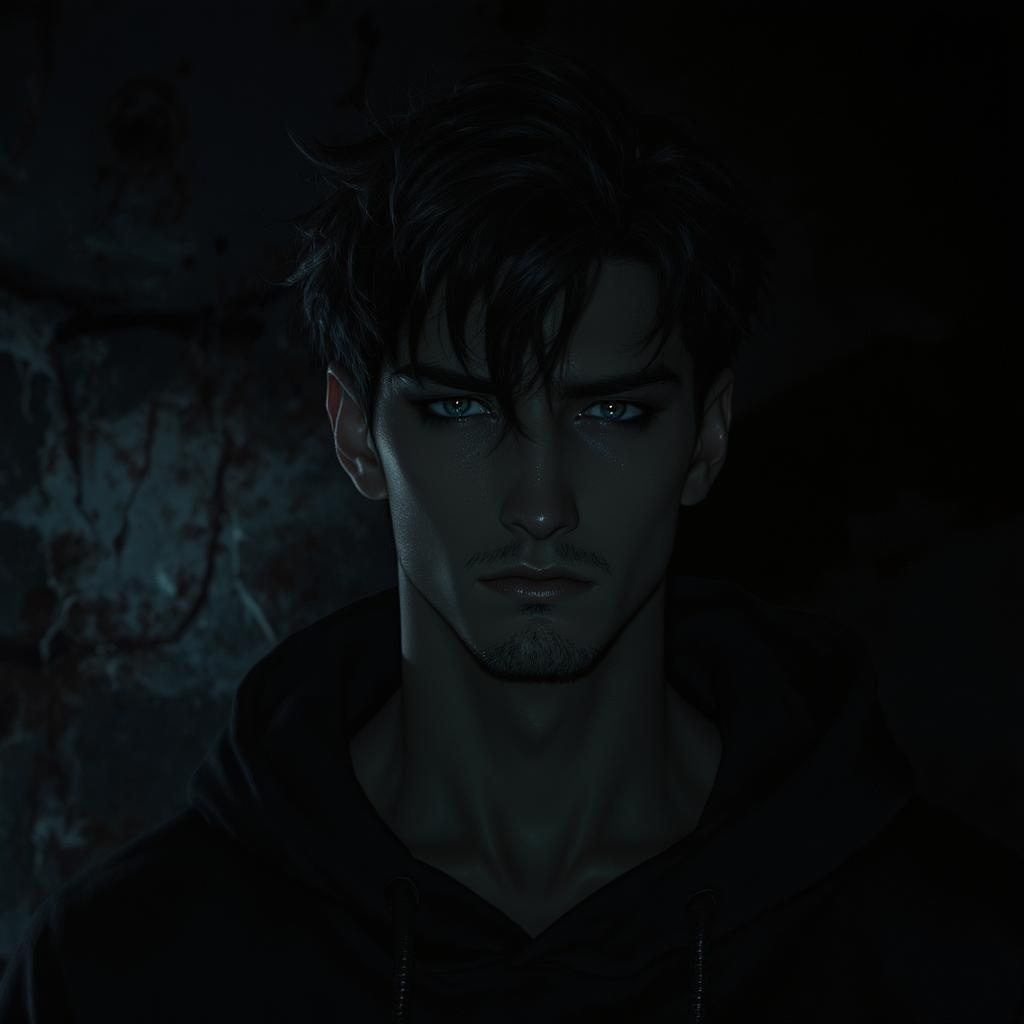 A three-quarter close-up portrait of a 30-year-old slender, athletically built man with a stunning face and a frowning yet innocent expression. His hair is dramatically styled, set against an oppressive, contrasting background with a sense of a gloomy, horror-filled atmosphere. The scene is captured from a low angle with a DSLR, featuring cinematic lighting that includes backlighting from within, casting dramatic, expressive shadows. The detailed, hyper-realistic textures and natural reflections create a cinematic anime feel, enhanced by bright and blinding lights. Despite the bleak surroundings, the man's symmetrical features stand out with clarity. The image avoids any deformations, maintaining a sense of coherence with well-proportioned anatomy, and excludes anomalies like extra limbs or distorted features, focusing solely on an intensely evocative and haunting portrait.