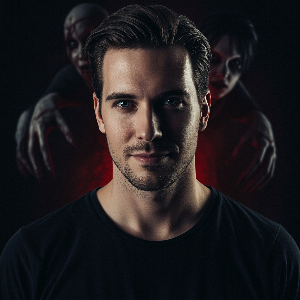 A three-quarter close-up portrait of a 30-year-old man, with a slender athletic build and a striking face, featuring a frowning yet innocent expression. His hair is stylishly swept back, adding to his charm. The background is oppressive and contrasting, exuding a dramatic and gloomy horror atmosphere. It's backlit from within, lending an expressive cinematic depth to the scene. The shot is captured with a DSLR from a low angle, offering a cinematic perspective with an aperture of f/7, a shutter speed of 1/100 sec, and ISO 150. The image is hyper-photorealistic, with super detailed textures and natural reflections, creating a vivid anime-inspired cinematic lighting effect. The lighting is intense, with bright, almost blinding highlights, while maintaining symmetry and balance. The overall composition remains free from deformities or distortions, ensuring a polished and engaging visual experience.