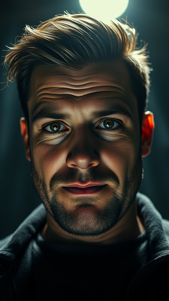 A three-quarter close-up portrait of a strikingly handsome 30-year-old man with a slightly overweight figure, featuring a captivating face and a curious, friendly expression. He sports a neat goatee and well-groomed hair. The oppressive background presents a stark contrast, evoking an unsettling, horror-like atmosphere with backlighting creating dramatic, expressive shadows. This cinematic shot is captured from below using a DSLR, with an aperture of f/7, shutter speed of 1/100 sec, and ISO 150. The image is super detailed and hyper photorealistic, showcasing natural textures and reflections. It incorporates cinematic lighting akin to anime, highlighting bright and blinding light, rivets, and symmetry. The composition avoids any deformities, maintaining perfect anatomical proportions and clarity, ensuring all elements are well-rendered and in focus, creating a harmonious and vivid visual impact.