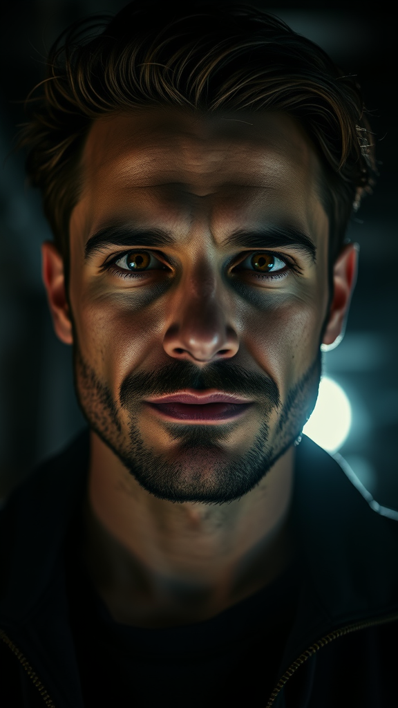 A three-quarter close-up portrait of a strikingly handsome 30-year-old man with a robust figure and a captivating face. He has a curious and friendly expression, a neatly trimmed goatee, and well-groomed hair. The background is oppressive and contrasting, with dramatic and expressive elements creating a gloomy and chilling atmosphere. The scene is captured in a cinematic shot from a low angle using a DSLR, with an aperture of f/7, a shutter speed of 1/100 sec, and ISO 150. The image is hyper-realistic and features detailed textures with natural reflections and cinematic anime lighting. The setting is symmetrical, with a bright, almost blinding backlight that adds depth and intrigue.