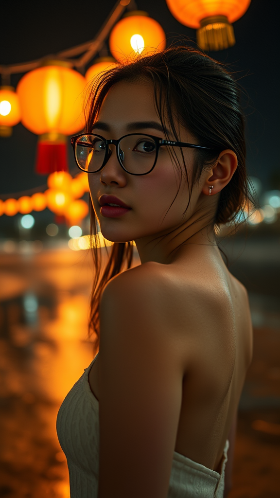 A three-quarter close-up portrait of a stunningly pretty 30-year-old Asian woman with an athletic figure and captivating face. She has a gentle and quiet expression, wearing glasses and gazing into the distance. Her hair is wet as she stands on a beach at night, around 11 pm, creating a dramatic and expressive background with a cool, glowing lantern-filled atmosphere. The lights of a nearby town twinkle in the background. Captured in a cinematic shot from a low angle with a DSLR, using a wide-angle lens at aperture f/8, shutter speed 1/250 sec, ISO 100, she is lit from behind to the side. The scene is super detailed and hyper-photorealistic, highlighting textures and natural reflections with cinematic lighting akin to anime. She wears heels, and the bright, somewhat blinding light enhances the setting's symmetry and elegance.