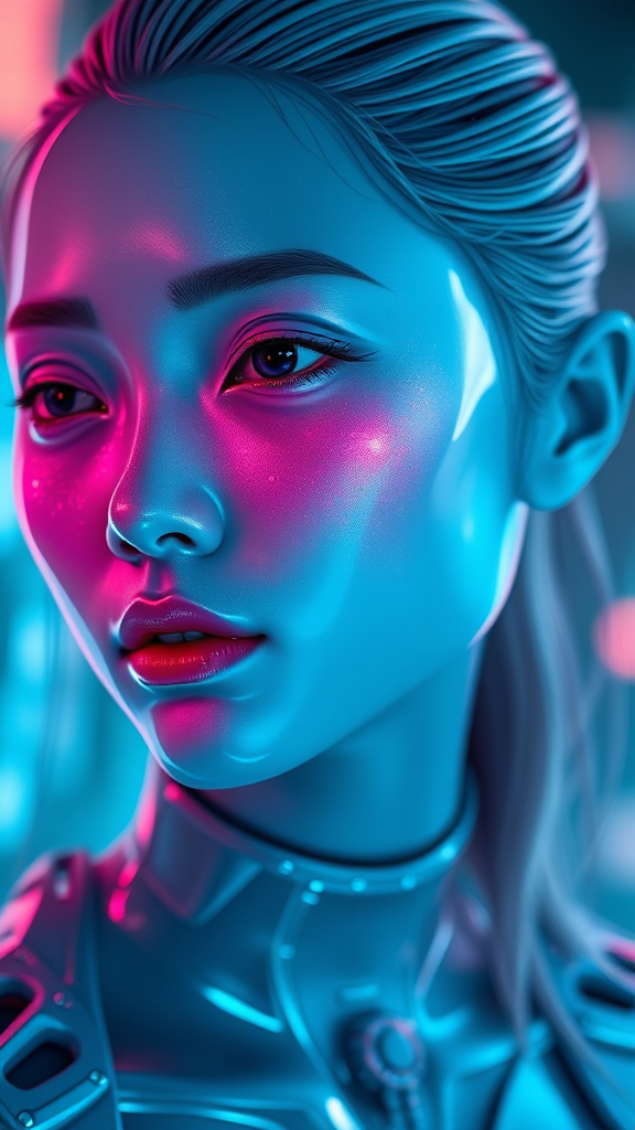 A three-quarter portrait of a blue-skinned figure with a luminous pink-tinged face, glistening with iridescent fluids, set in a futuristic sci-fi universe. The hyper-realistic portrait features Asian-inspired details, embracing a palette of soft whites and rosy pinks. The texture is glossy and highly reflective, capturing photorealistic accuracy with an aurorapunk flair. The scene blends high-tech elements with ethereal aesthetics, maintaining a balance of raw, vivid realism and dreamy, otherworldly essence.