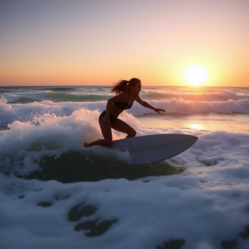 A thrill-seeking surfer catches a wave at dawn, the golden sun rising against the horizon as she expertly navigates the ocean's powerful embrace, her silhouette carving through the surf with fearless grace.