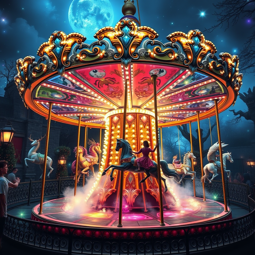 A thrilling adventure on an enchanted merry-go-round, where each spin transports riders to fantastical realms filled with mystical creatures and shimmering landscapes.