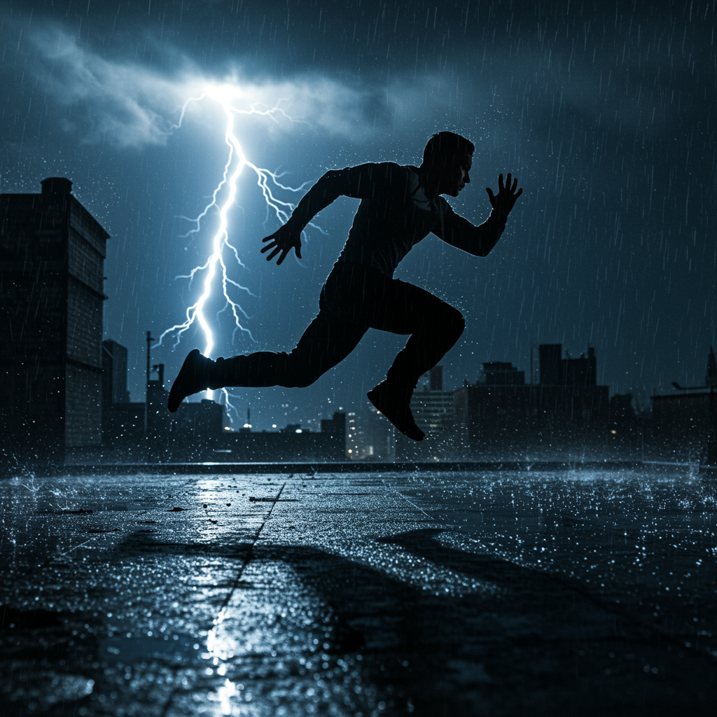 A thrilling chase unfolds under a stormy sky, as a figure sprints across rain-slicked rooftops, their silhouette sharply defined by flashes of lightning, muscles tense and poised, eyes focused with determination, shadows dancing around them amid the chaos, every leap precise, every landing graceful, capturing the raw energy and intensity of their daring escape.