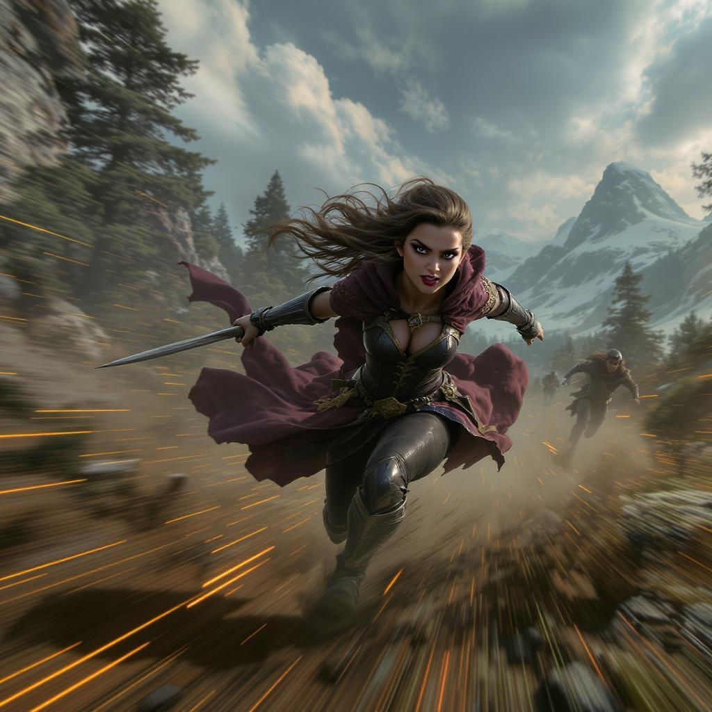 A thrilling cinematic chase scene unfolds with dramatic motion blur, featuring a daring and beautiful rogue princess. Inspired by Miyazaki's enchanting storytelling, the scene is rendered in photorealistic and hyperrealistic detail, capturing the essence of both fantasy and intense action. The princess, with windswept hair and determined eyes, navigates a vivid, lush landscape, her presence both mesmerizing and commanding as she eludes pursuers with agility and grace. The atmosphere is charged with tension and breathtaking beauty, blending realism with the dreamlike quality of an animated epic.